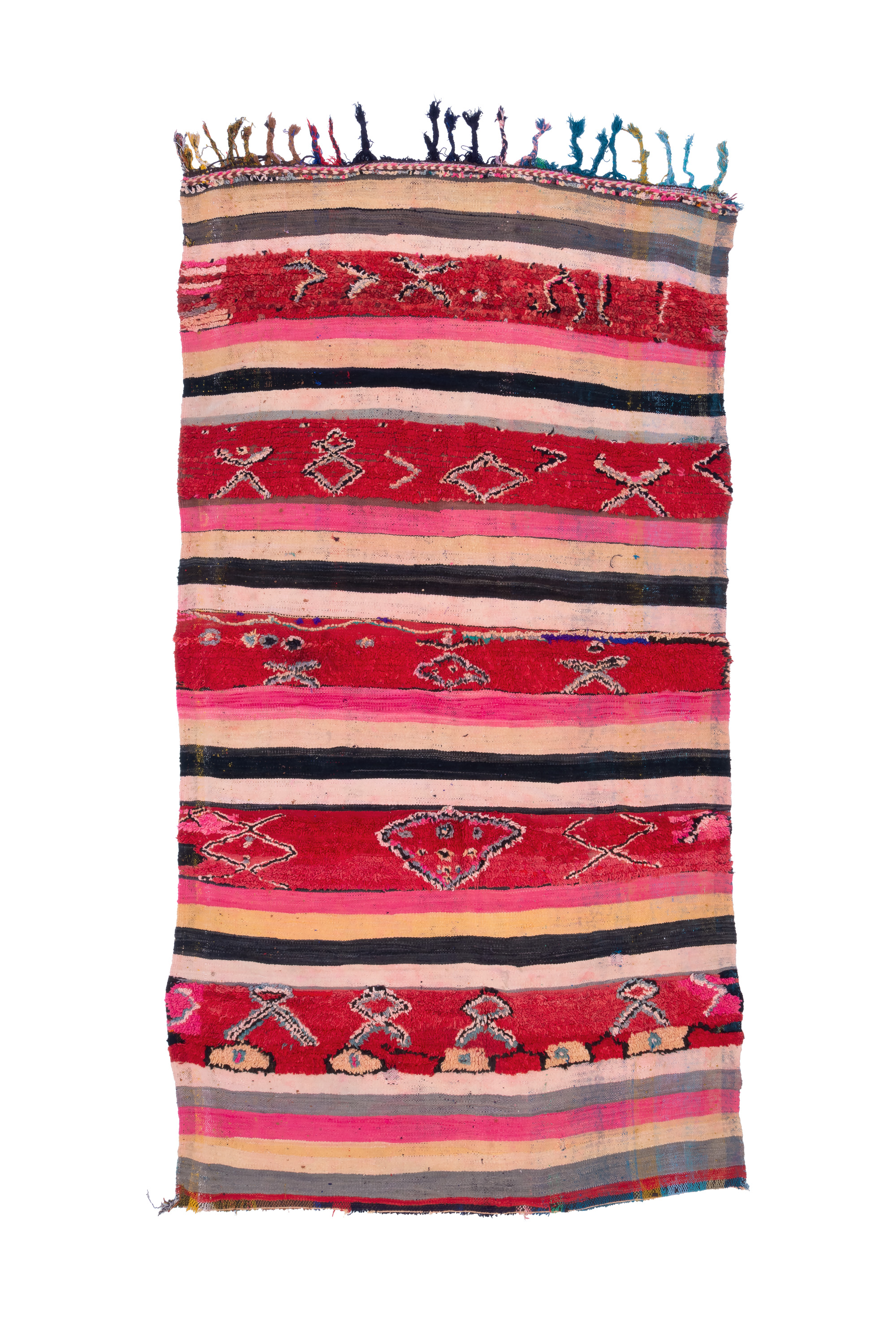 BOUJAD rugs are made by Arab groups and Arabized Berber groups but they are named after the town of Boujad. The surrounding region of this town lies in the western foothills of the Middle Atlas adjoining the Zaer tribal territory in the extreme western corner, and the town Beni Mellal at the northernmost edge of Western High Atlas. The knotted rugs have typically a low pile and are often made with mixed materials such as wool, cotton, textile scraps and industrial yarns. Their designs are often highly individual containing Berber motifs, motifs found in Rabat rugs, distorted checkerboard fields and gestural abstract patterns- all in lively colors.
