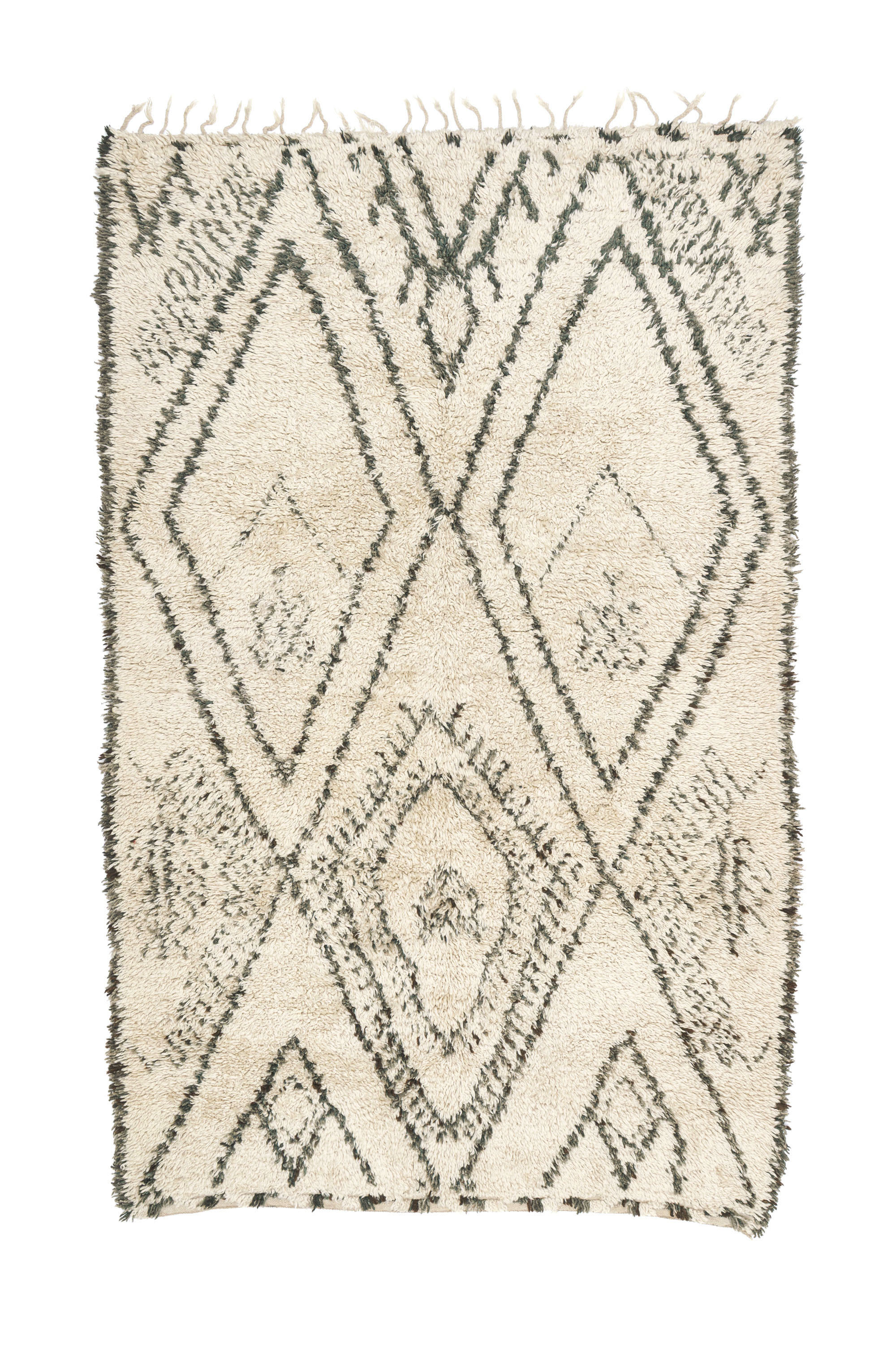 An Ait Seghrouchène rug, 1980s – 90s, featuring a large-scale pattern with abstract, drawing-like motifs, notable for its highly distinctive design. Knotted from locally processed wool, the rug has an archaic pile with a slightly deeper beige tone than other white rugs. Its overall composition has a naïve yet appealing quality, displaying playfully simplified patterns that loosely recall those of the Marmoucha, a neighboring tribe to the east, while more distinctly evoking motifs found in women’s tattoos. As this tattooing tradition has largely faded, with most remaining tattoos seen on older women, such visual echoes offer a rare link to a disappearing aspect of Berber cultural expression.