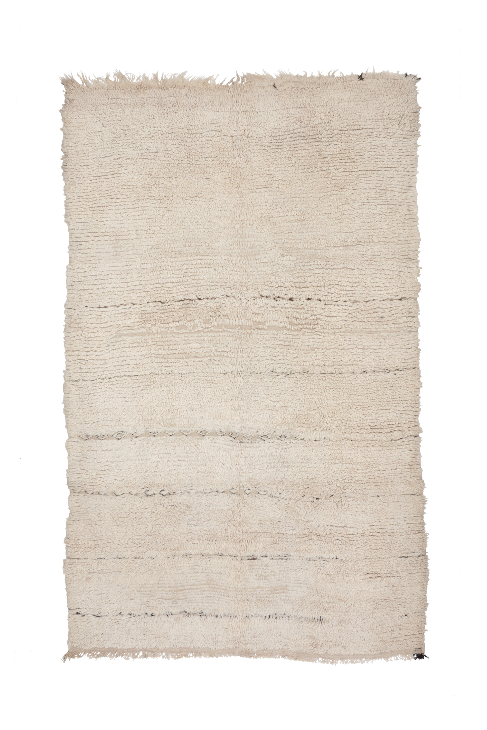 A subtle Bnchgra from the Beni Ouarain, 1970s-80s, with horizontal pattern bands peeking through the ivory colored pile. The loop pile is made by hooking and pulling weft threads into loops, generating an interesting texture on the surface. Bnchgras were originally made to use as a cover but can be used a a floor covering.