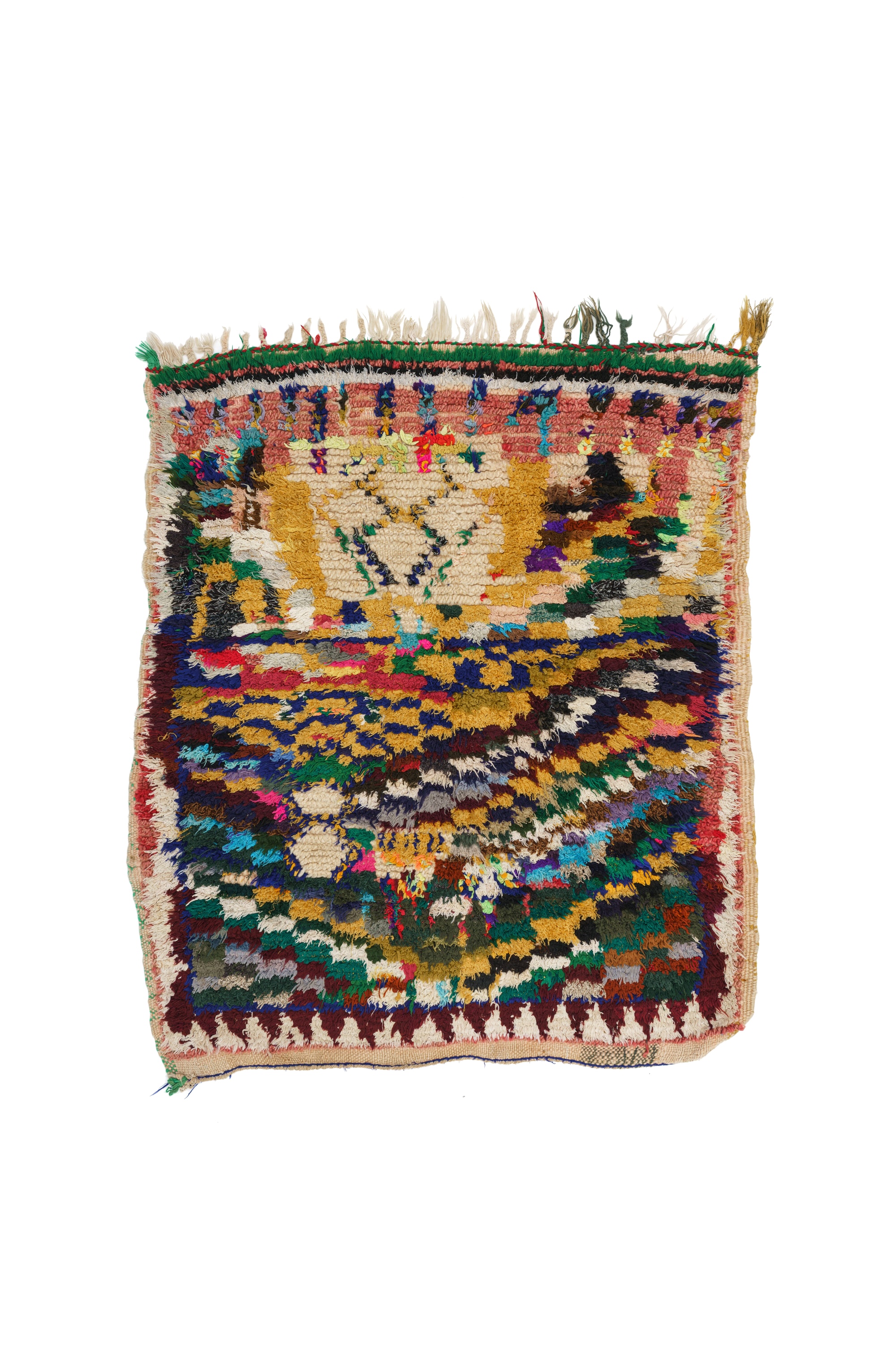 BOUJAD rugs are made by Arab groups and Arabized Berber groups but they are named after the town of Boujad. The surrounding region of this town lies in the western foothills of the Middle Atlas adjoining the Zaer tribal territory in the extreme western corner, and the town Beni Mellal at the northernmost edge of Western High Atlas. The knotted rugs have typically a low pile and are often made with mixed materials such as wool, cotton, textile scraps and industrial yarns. Their designs are often highly individual containing Berber motifs, motifs found in Rabat rugs, distorted checkerboard fields and gestural abstract patterns- all in lively colors.