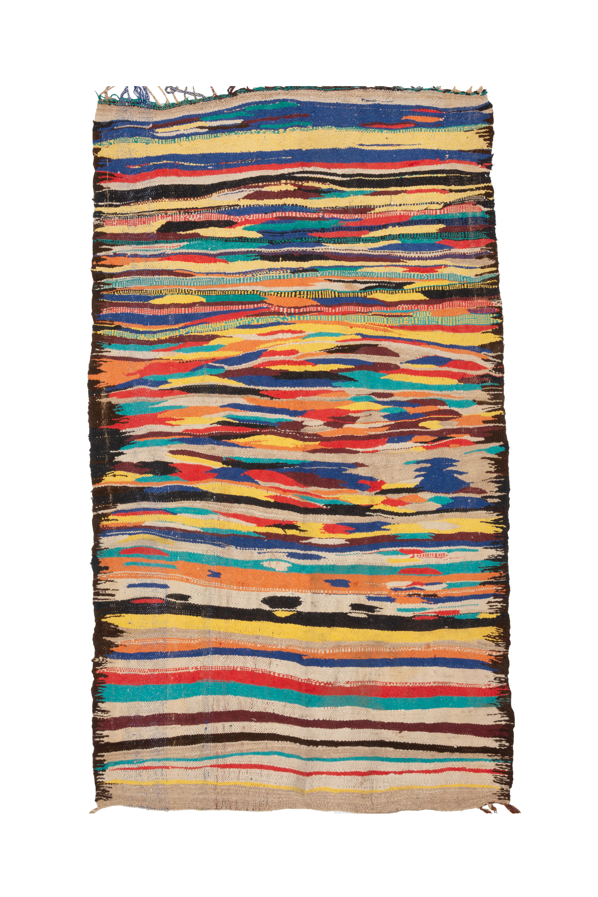 A spectacular and highly unusual kilim, 1990s, with a medium fine weft and a bold colorful composition framed by „flaming“ sawtooth edges. Countless variations in color and shape enrich the horizontally oriented pattern and turn it into it a vibrant and pulsating weaving. This flatweave most probably stems from the coastal region of central Morocco. The Boujad region was defined in the 1990s, named after the town of Boujad. Today, with an expanded view of it, the boundaries of the area defined then have shifted and expanded. Most important though, is that today’s weaving culture in central Morocco is still very much alive and diverse. Please note: There are fringes on the upper edge, which are not visible in this image.