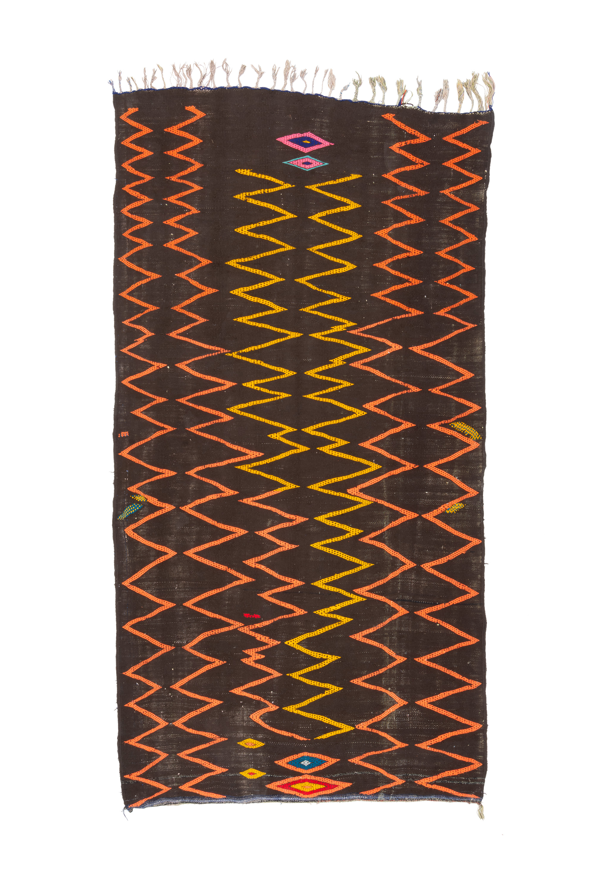 A highly unusual, eccentric flatweave from the early 2000s, featuring an electrifying lozenge pattern arranged in a zigzag layout set against a dark brown ground. The strong color contrast, joyful play of bold hues, and added variations make this rug a highly desirable piece and a striking visual statement. Please note: this rug should not be vacuumed with a powerful vacuum cleaner and is best placed in a low-traffic area of the home.
